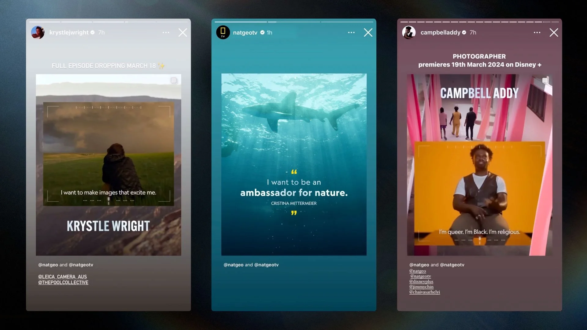 National Geographic approached us to promote Photographer, a new series offering a behind-the-lens look at six renowned photographers across fields from nature conservancy to high fashion. Known for their legacy in print and digital, Nat Geo was now aiming to expand their social presence with premium, narrative-driven content and audience-first activations. I led a team of designers and video editors to create elevated design and motion pieces that highlighted each photographer’s creative process and personal influences.